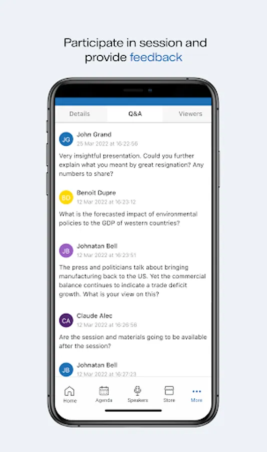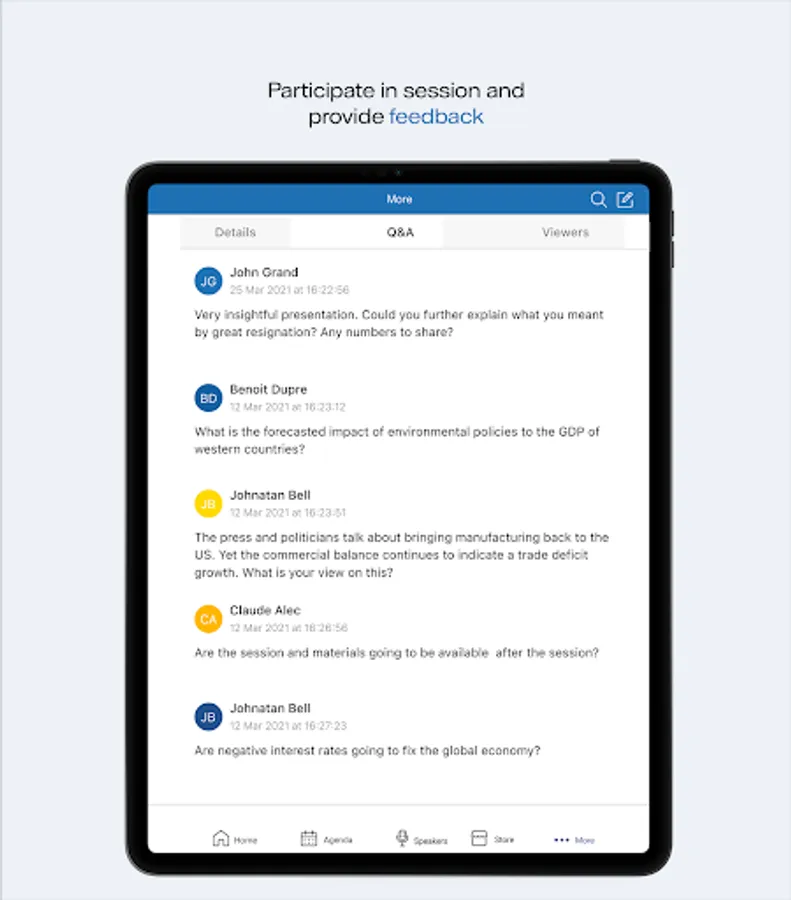 Message, exchange digital business cards, schedule meetings, complete surveys, create personal agendas, participate in live Q&A and polling sessions, study virtual libraries and meeting information, review case studies, browse speaker and attendee profiles, follow presentations, take notes, save items for after your event, and much more.