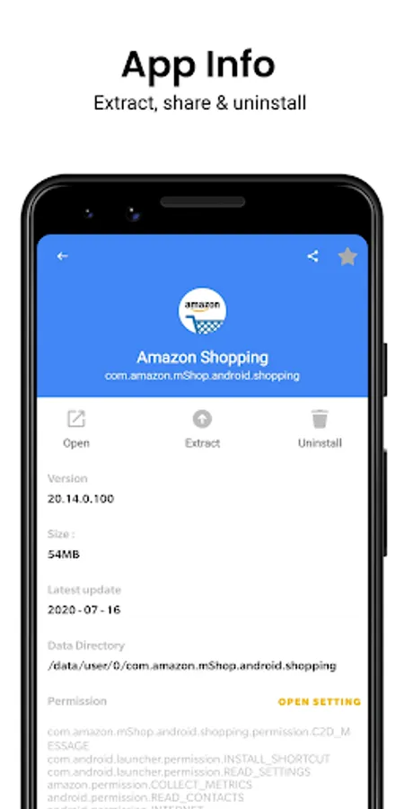 App Manager is a wonderful app to help you manage your apk files on your device, analyse your apk files (app size, version, permission, etc), extract your apk files and back-up the application.