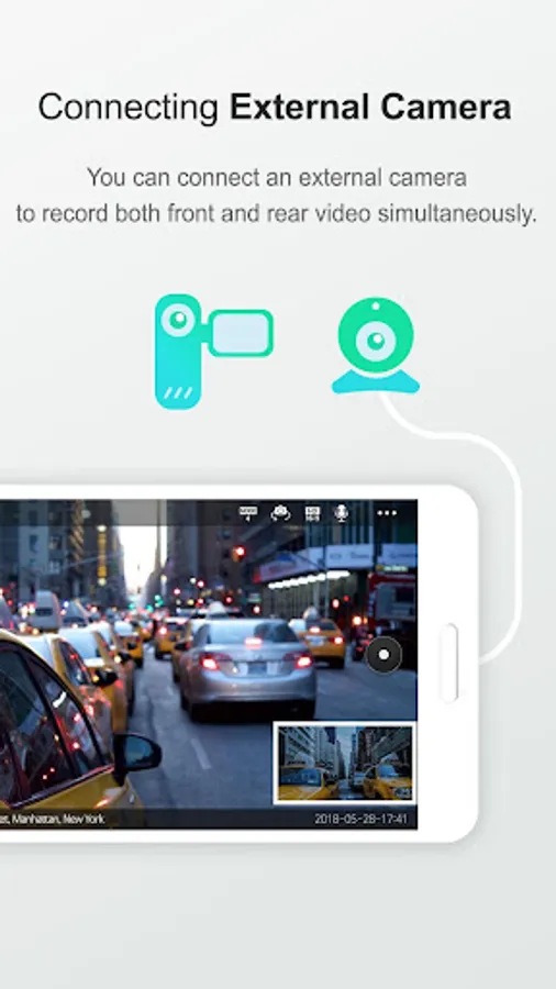 You can connect an external camera to record both front and rear video simultaneously.