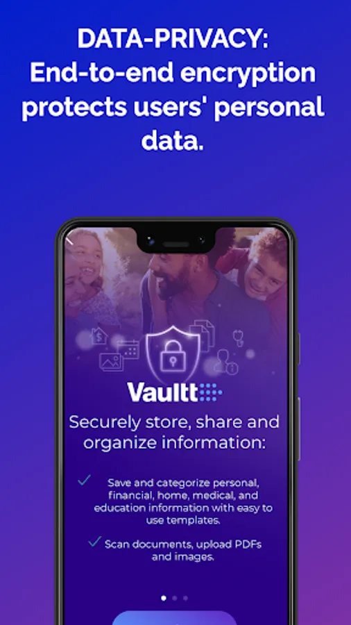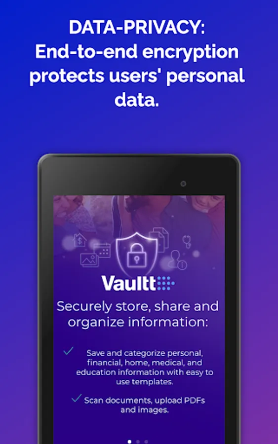 Vaultt is secure by design with end-to-end encryption to protect users’ sensitive personal data. Vaultt employs a hybrid cryptographic approach, layering asymmetric and symmetric encryption, to ensure the ultimate in speed and data protection. This higher level of security assures privacy and confidentiality, exceeding the security of today’s standard banking mobile apps. Encryption and decryption occur in the user’s app to ensure that only the user and invited members can access the data. Vaultt does not have access to the cryptographic keys required to decrypt users’ data, ensuring that even Vaultt employees cannot access it.