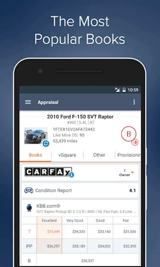 The vAuto appraisal system (www.vauto.com) is now mobile - bringing the power of vAuto to the lanes. Dealers are able to access CARFAX reports as well as all third party guidebook values including vAuto's exclusive rBook(TM) - the live, retail pricing guide for identically equipped vehicles in your market.