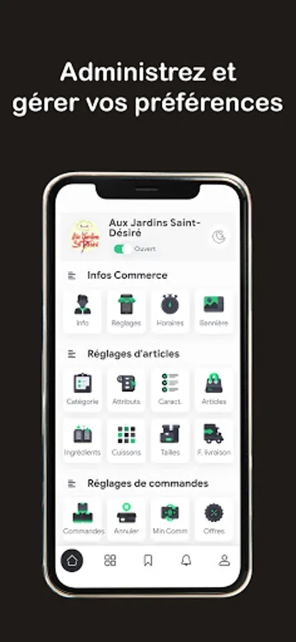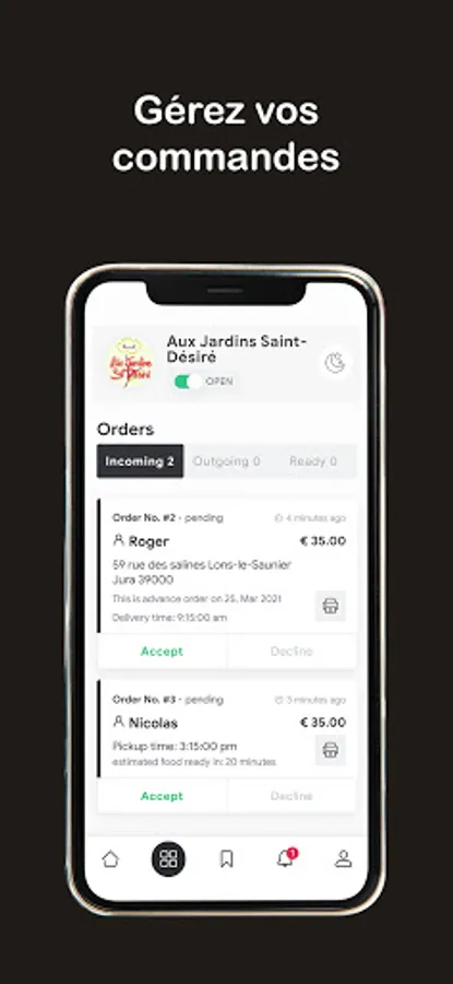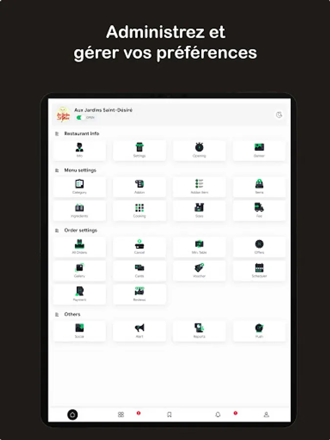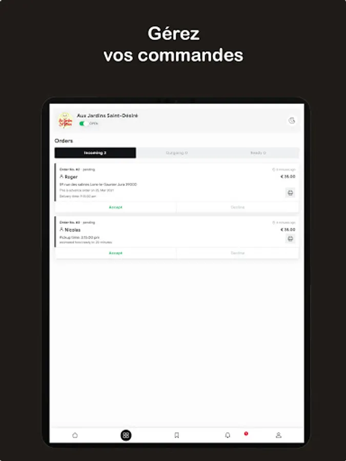 Thanks to this application, it is possible to manage all the orders in real time (Orders, click & collect, passage, telephone or digital), to modify the existing articles and to add new ones, to manage the orders and validate or reject them.