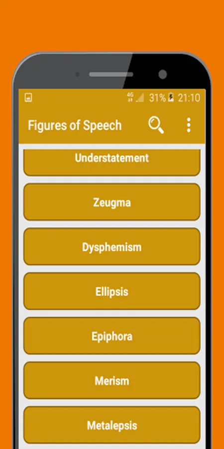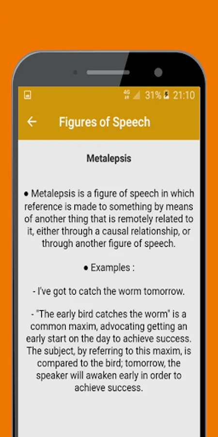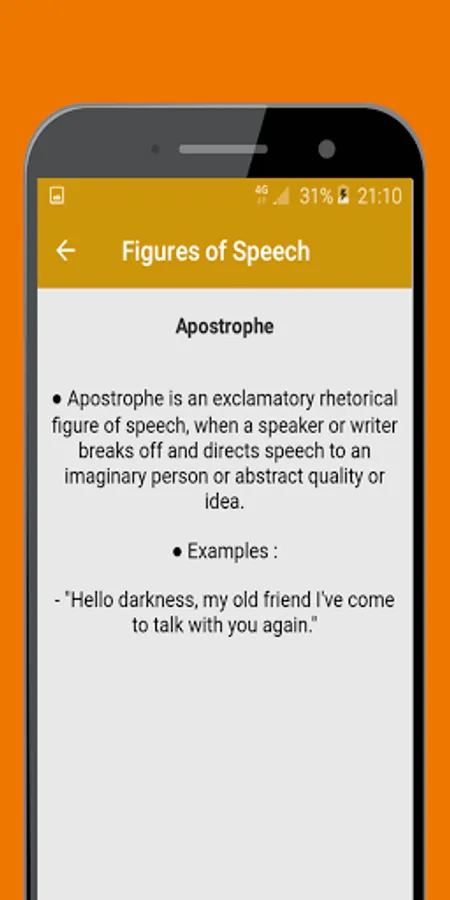 In literature and writing there is list of figures of speech the app is consists from 35 of figures of speech with meaning and explanations with examples.
