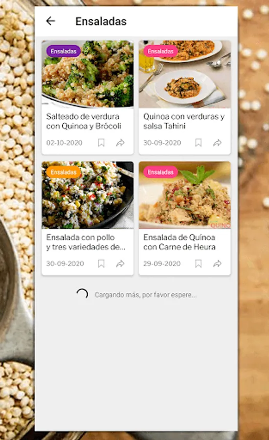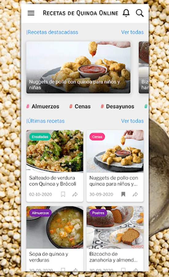 In this simple application you can see and share the richest quinoa recipes that you will find on the internet. In addition, you can share your own from our website (https://recetasquinoa.online) and both you and your friends will have it instantly available in the application.