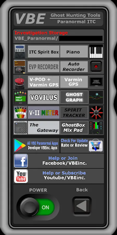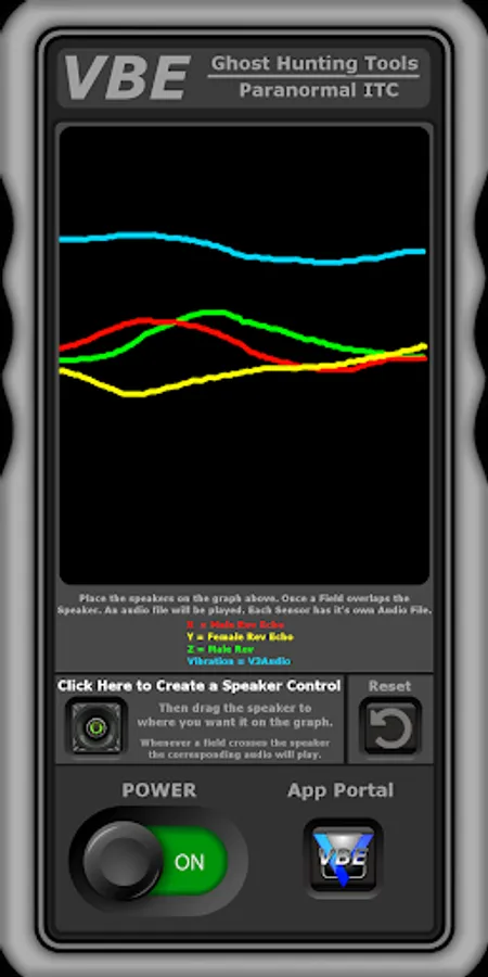 1) ITC SPIRIT BOX: This tool was Designed after the Famous P - Sb7 Spirit Box. However, our app uses no Radio Signals. Our app uses Reversed Garbled Audio that allows for NO WORDS to be Generated by the app itself. This app has a Static Sweep and a Full Blown Ghost Box in one. You can also use your sensors to activate the Garbled audio only when a reading is higher then your filter.