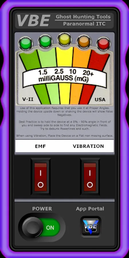 5) V-II Meter: This was Designed after the Famous K2 ( KII ) meter. The difference again is large. While ours is setup to read EMF like a K2. Ours does not read itself. I have personally owned 4 K2 Meters in my life and only 1 read properly. This app uses your Device to Read Electromagnetic Fields. However, just like a K2 Meter. You must hold your device at proper angles ( 0%-90% ). It also has a Vibration Feature that the K2 does not have.