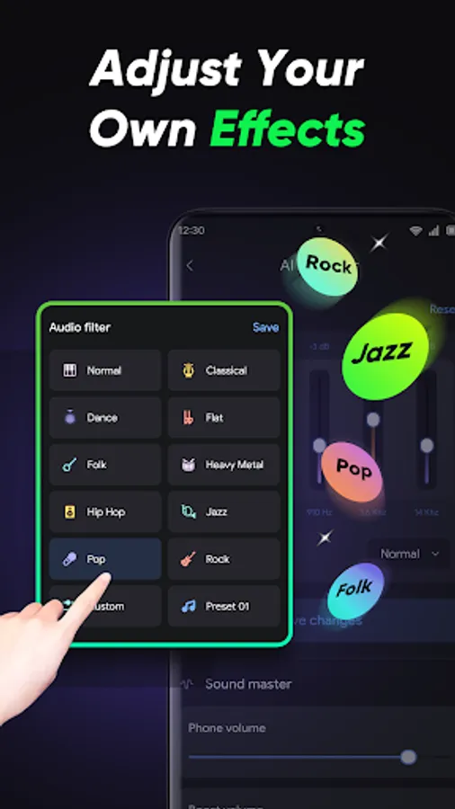 Go to bass booster/volume booster feature, customize bass, preset Jazz, Pop, Hiphop, Rock,.. , EQ. Take full control of your music with our 10-band sound equalizer