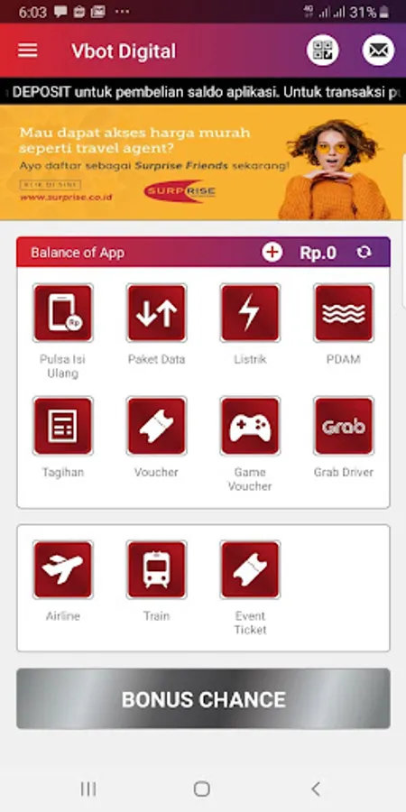 Vbot Digital is an application that can be used to topup prepaid number in Indonesia, pay bills, BPJS, PDAM, electricity, travel, etc.