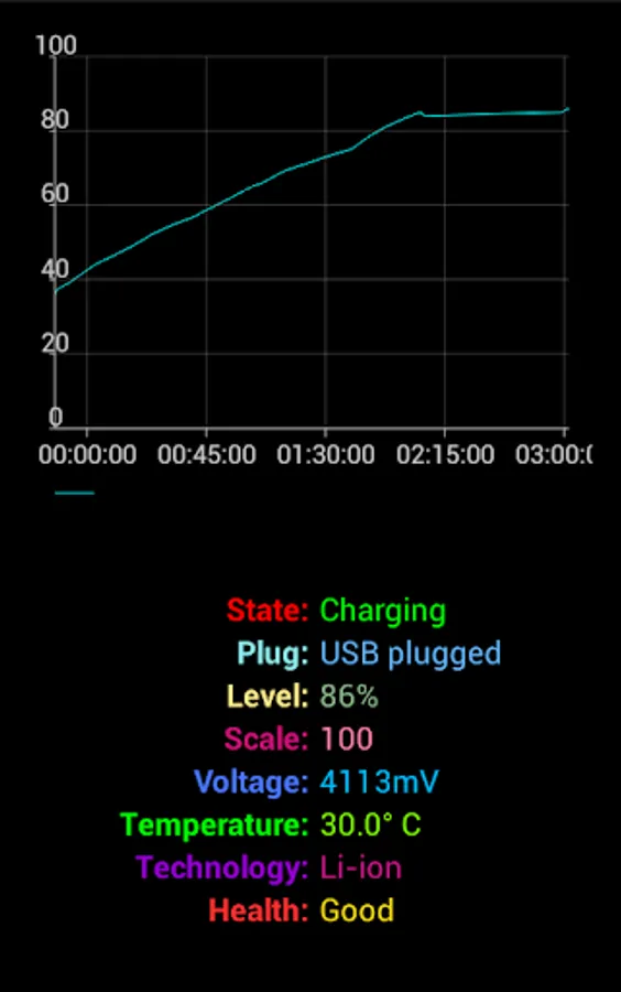From the application menu you can check the battery level, battery level, voltage level and battery temperature. With graphical application you can make instant measurements.