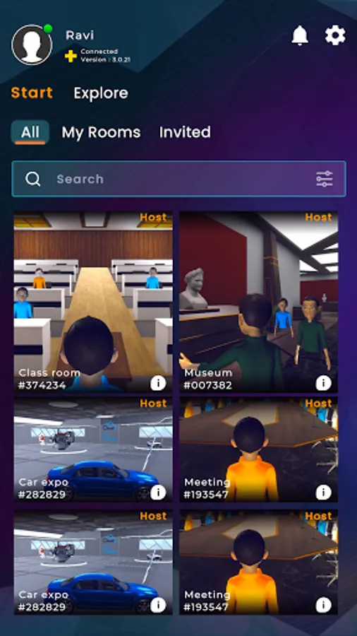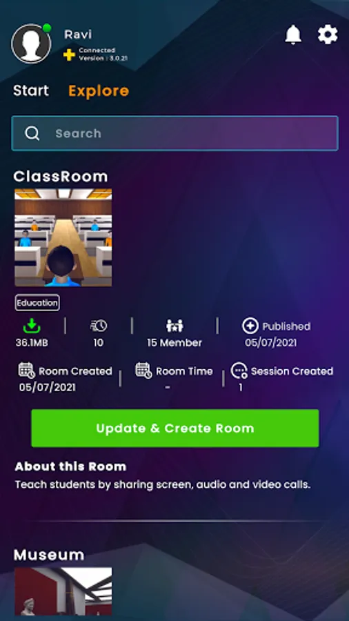 * Explore Section contains all the available environments/assets. User can download and create rooms in the selected environment.