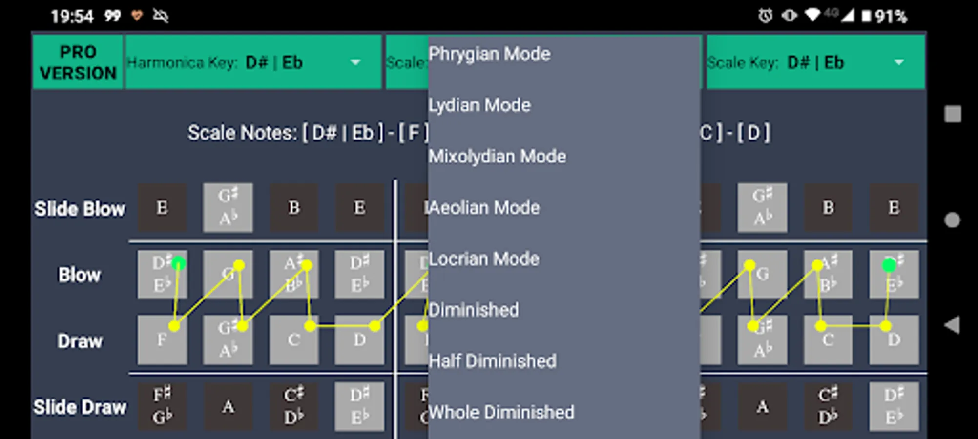 Scales available in Premium Version: Major, Natural Minor, Pentatonic Blues, Pentatonic Major , Pentatonic Minor , Harmonic Minor, Melodic Minor, Bebop Dominant, Pentatonic Neutral, Ionian Mode, Dorian Mode, Phrygian Mode, Lydian Mode, Mixolydian Mode, Aeolian Mode, Locrian Mode, Diminished, Half Diminished, Whole Diminished, Whole Tone Diminished, Dominant 7th, Lydian Augmented, Lydian Minor, Lydian Diminished