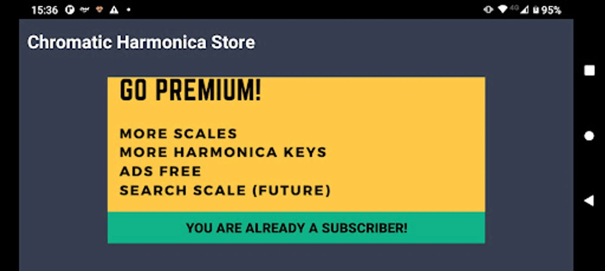 Premium Version includes: All Harmonica Keys, Various Scales in all keys, and does not have ADs (Yearly Subscription).