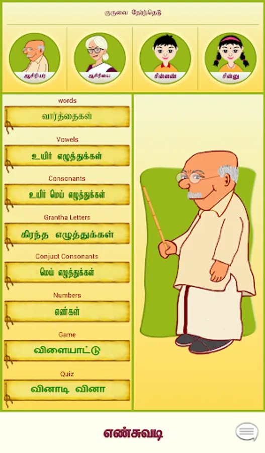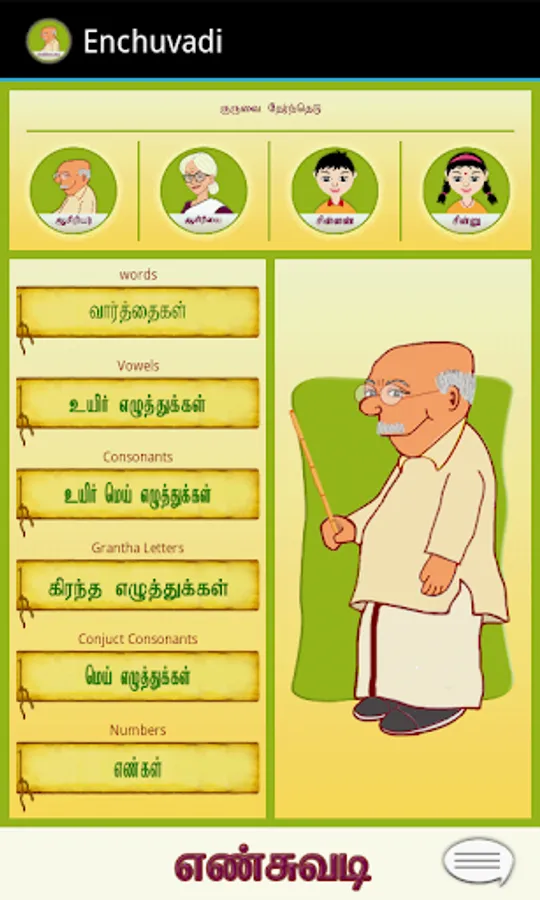 Are you worried about missing the sweetness of Tamil for your kids? We take the privilege of cordially inviting you to make the best use of our Enchuvadi APP. Are you remembering the nostalgic ' Enchuvadi' which you used to carryout during your nursery days? 'Enchuvadi' is the digital version of same Enchuvadi which will still fill a nostalgic feel in you.