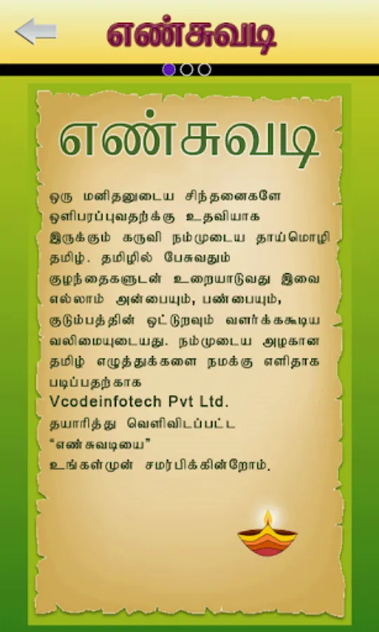Tamil ! One of the most powerful language in earth. Tamil is evolved through the reformation process of centuries. Tamil is the mother tongue of Tamil Nadu Each Tamilians is proud by themselves for being the spoke person of Tamil. Unfortunately a certain percentage of the Tamilians are living outside Tamil Nadu for their job purpose. This application is also helpful for the kids who are residing in Tamil Nadu but missing the opportunity to learn Tamil due to the use of other language medium in nurseries. So, as the result, the NRT kids are missing the vibrant power of Tamil through out their lives.