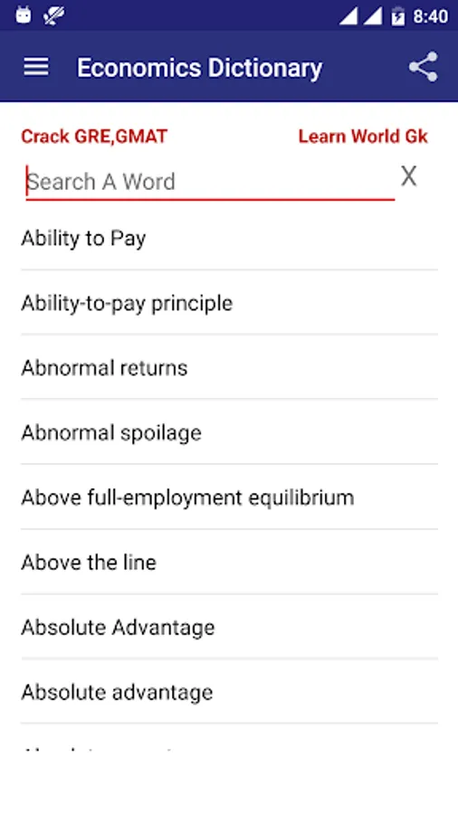 Free Offline Economics Dictionary app containing over 10000 basic and common economic terms (a-z) and their definition for and students to look up the definitions and technical terms in a second.