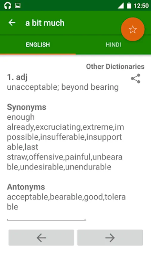 अंग्रेजी-हिन्दी-अंग्रेजी शब्दकोश or English to Hindi & Hindi to English Dictionary is a free offline dictionary app with over 150000 Words with their antonyms and synonyms and their usage as adjective , adverb or as a noun .