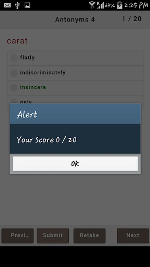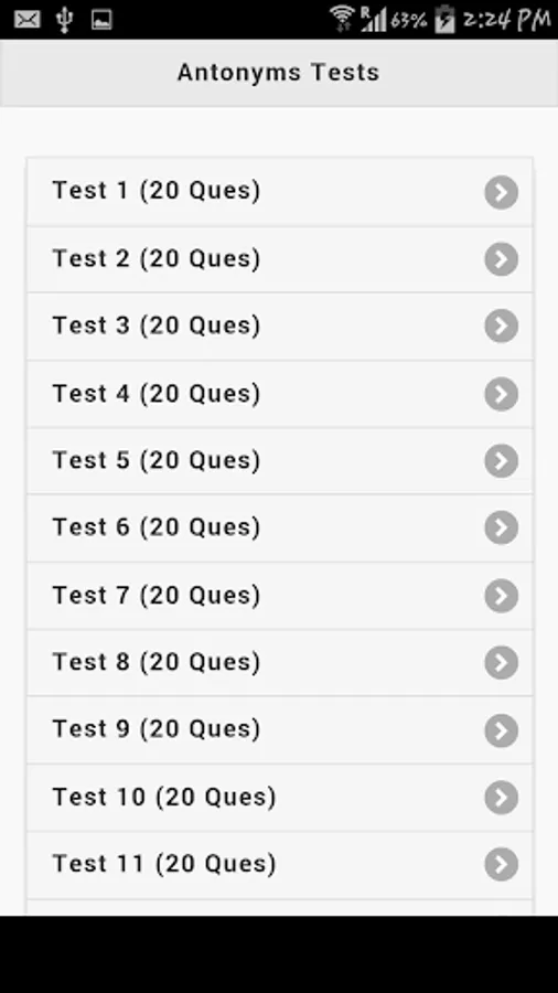 Every test contains 20 questions and each question has 4 answer options. You have to select the correct answer. You can submit your answers to get the score and see the correct answers