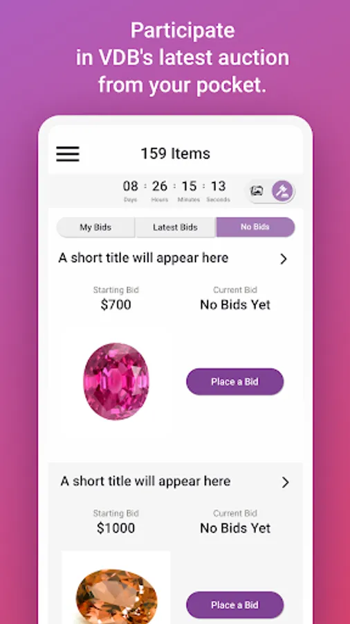 Participation in VDB Online Auctions requires proof of jewelry industry affiliation. Download the app, then register for an account. Once your account has been approved, you will be able to log in and participate in future auctions.