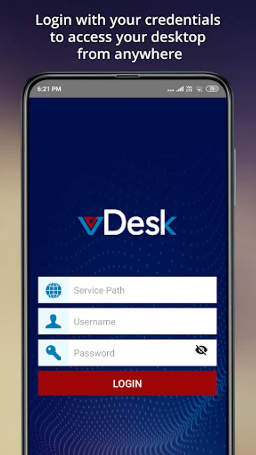 For accessing vDesk.Works Hosted Desktop you need to enter "Service Path" provided by your Network Admin, or by vDesk.Works Support along with your vDesk.Works account "Username" and "Password".