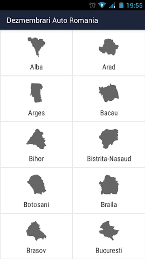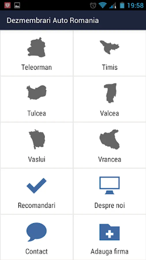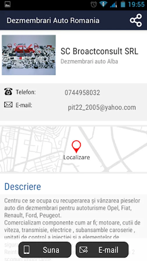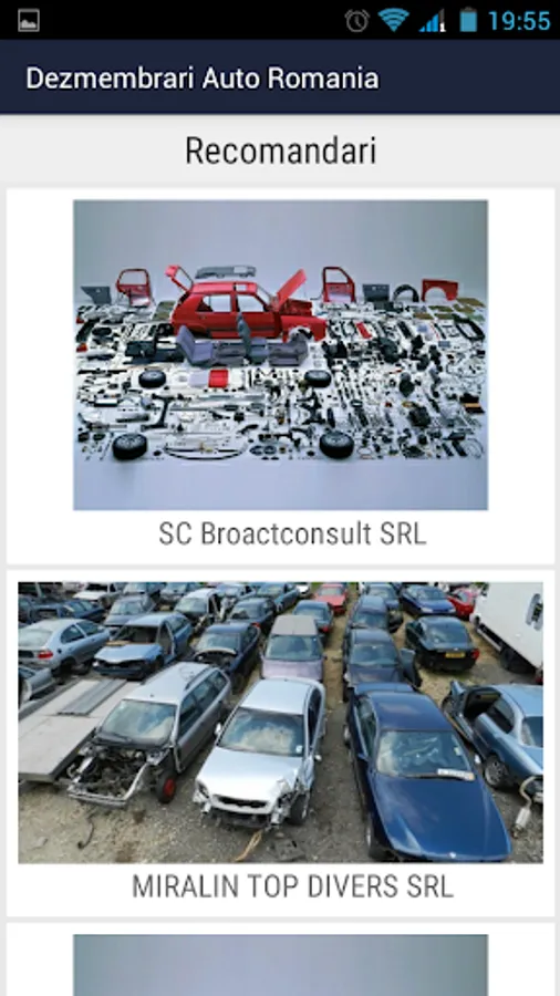 The application provides detailed information on: auto dismantling parks in Romania, Sales / Purchases: Used Auto Parts, Vehicles damaged / undamaged, Purchasing auto scrappage program.
