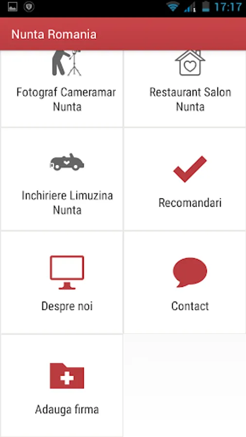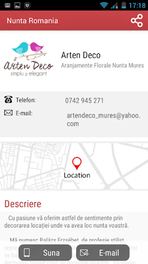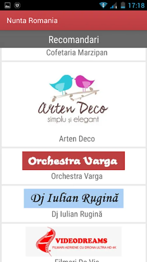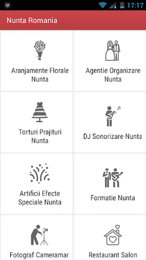 The application provides complete information about specialists in organizing special events: florists, floristry (floral bouquet candle wedding) agencies organizing weddings, confectioneries (cakes / cookies wedding), photographers / videographers, restaurants and salons wedding DJ and Band music wedding musicians, fireworks pyrotechnics company specialized in special effects, car limousine rental companies and wedding carriages (one representative per county).