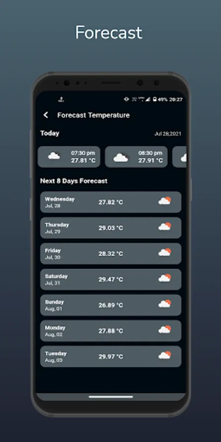 - Today and the next 8 days' temperature with different weather conditions icons.