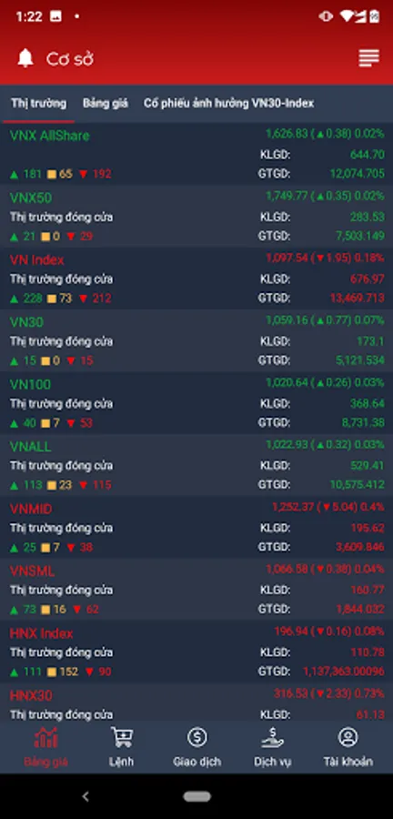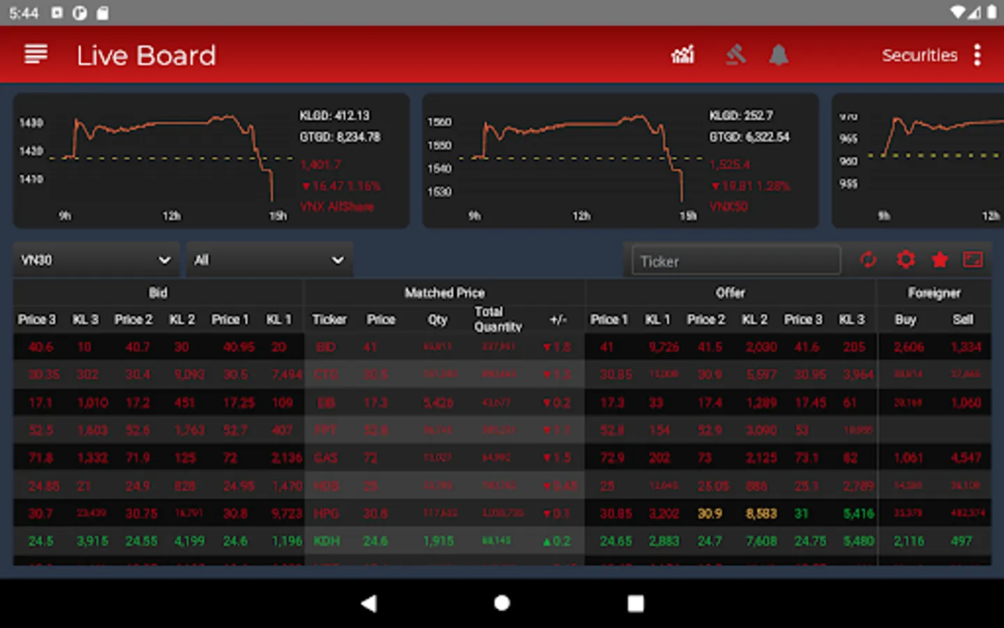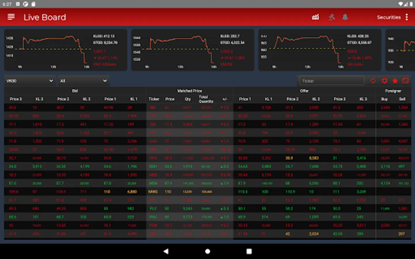 - Online price list with many features: Choose stock list displayed by default (VN30, HNX30 ...), or create a list of stocks of interest by yourself; Industry classification helps customers easily filter Securities codes; Support to track detailed information of a Securities code: trading deals during the session, total buying surplus, total surplus, matching chart, business situation of the business, basic indicators and news most relevant ...