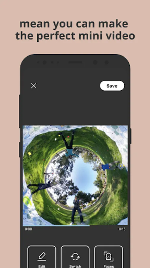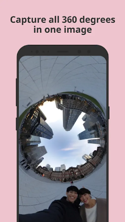 Use this function to make tiny planets, reverse tiny planets, or any angle of image from your original 360 photo. You can frame the image exactly how you like - just drag to change the point of view and pinch to zoom in and out, then export to your smartphone and share!