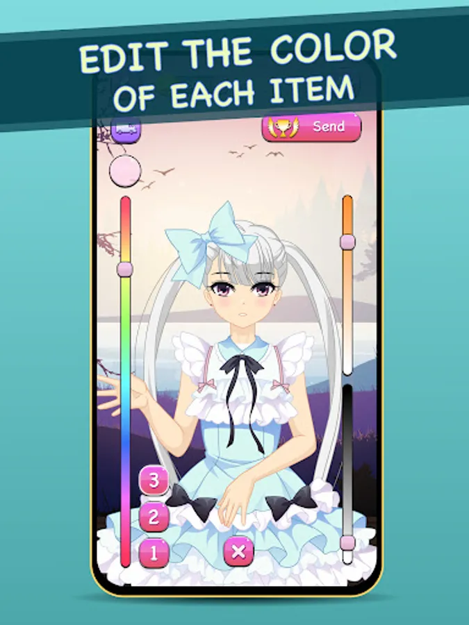 Train your skills as outfit designer by dressing up anime girls in fabulous apparel and creating gorgeous looks with makeup and hairstyles in a beauty salon! Unlock makeup tools and do trendy makeup looks! How will you dress up and style your doll today?