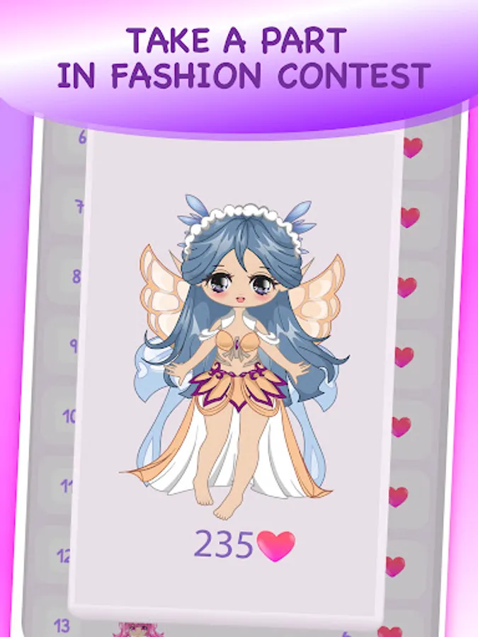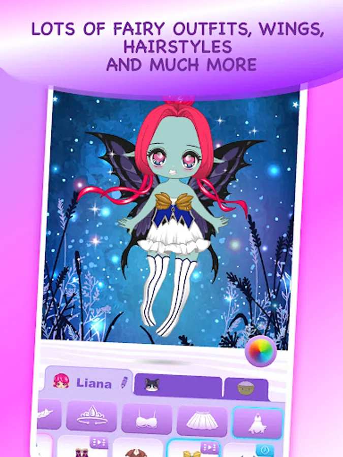 Pick the cutest clothes and the best hairstyles, design your chibi dolls in the magic style and use it right away. Play with this amazing new game for girls to make your unique look, show your imagination and fashion sense every time you make a new cute avatar on your smartphone! Make your own chibi fairy today!