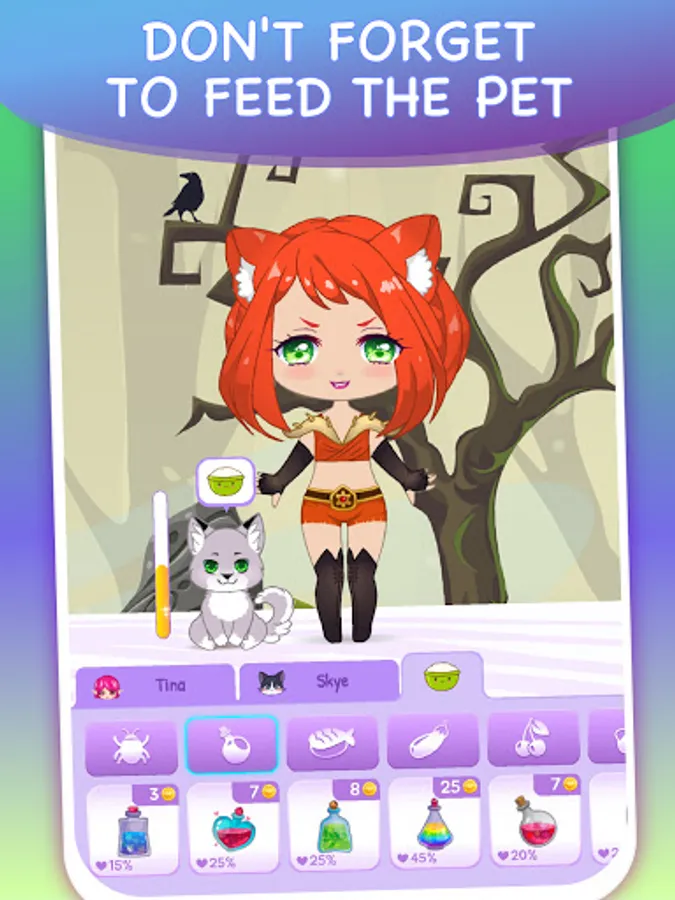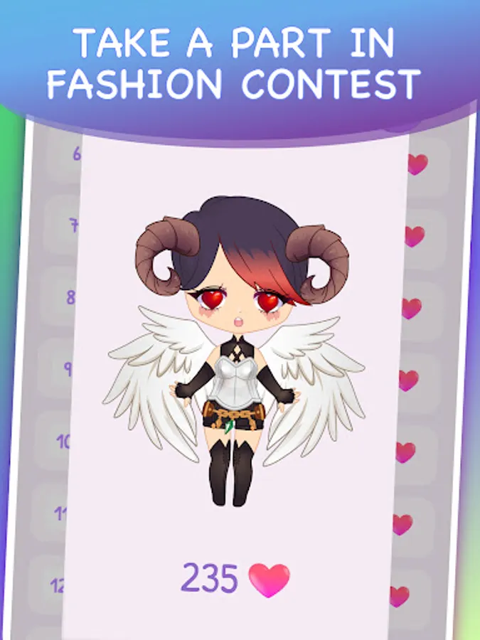 Decorate your chibi dolls using clothes, items, ears, tail, wings, dresses, make up and skin color Turn your doll into fairy, elf, vampire, witch, mermaid, pretty monster or manga barbie.