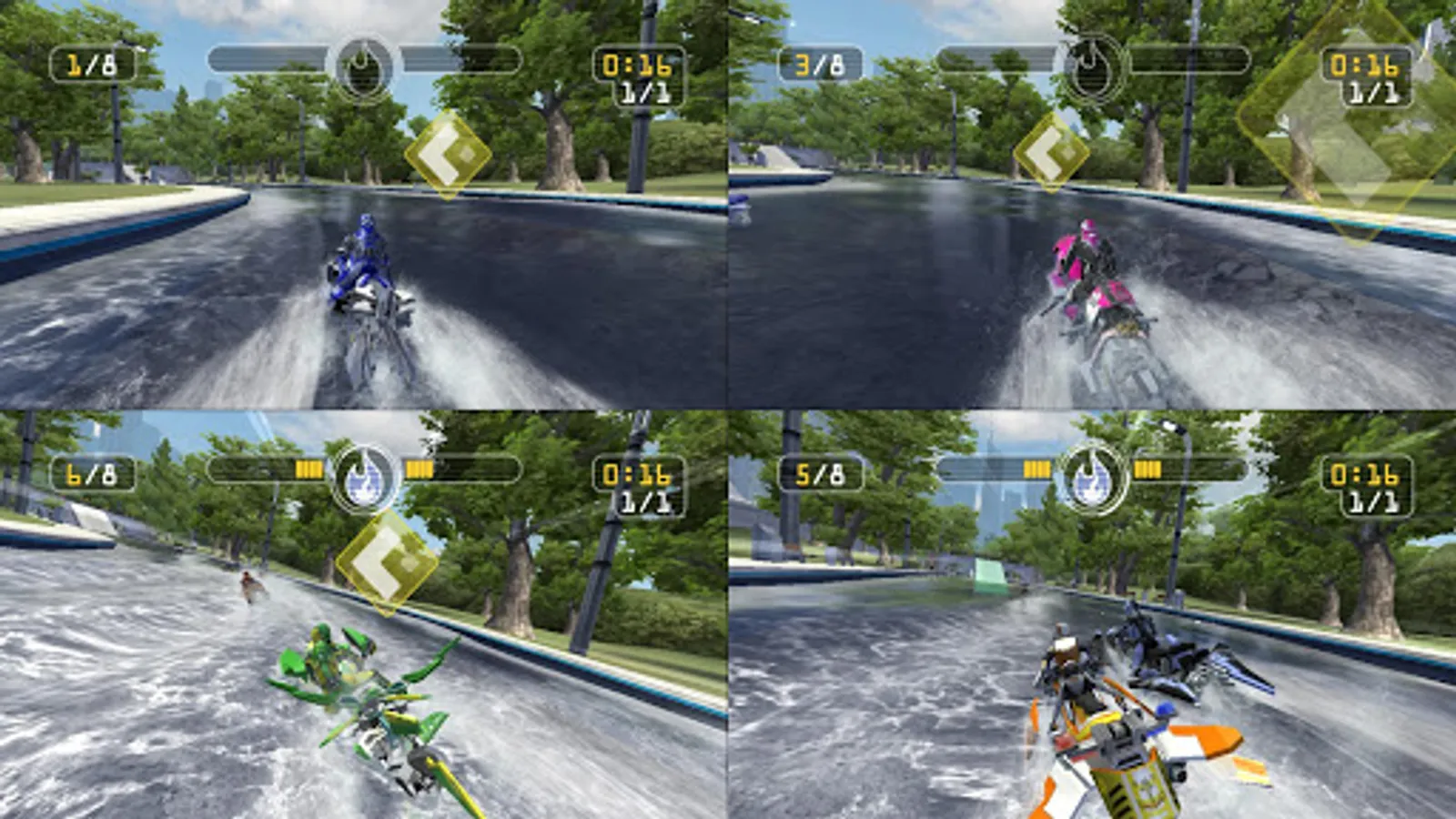 Experience the future of illicit hydrojet racing, where armored riders kick out death-defying stunts over massive waterfalls, dodge cops through public waterways, and boost at breakneck speeds across surging waves.