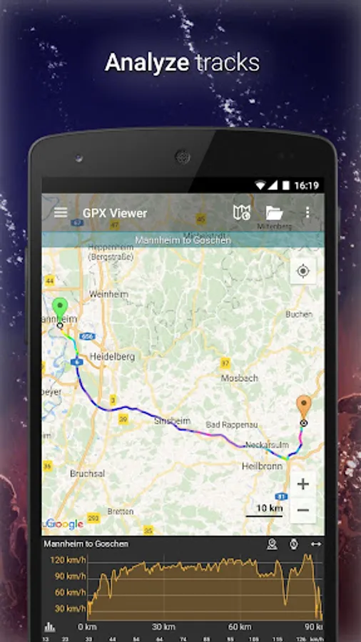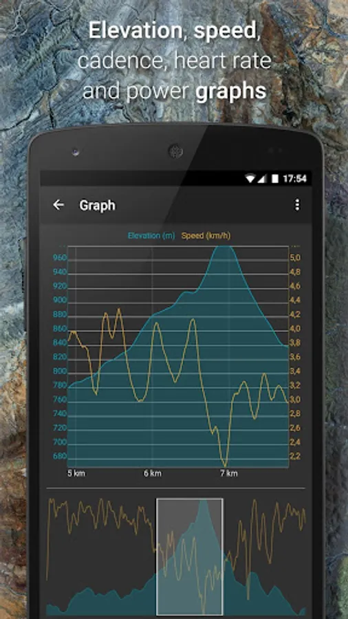 • view graphs (charts) like elevation profile and speed profile for tracks and routes