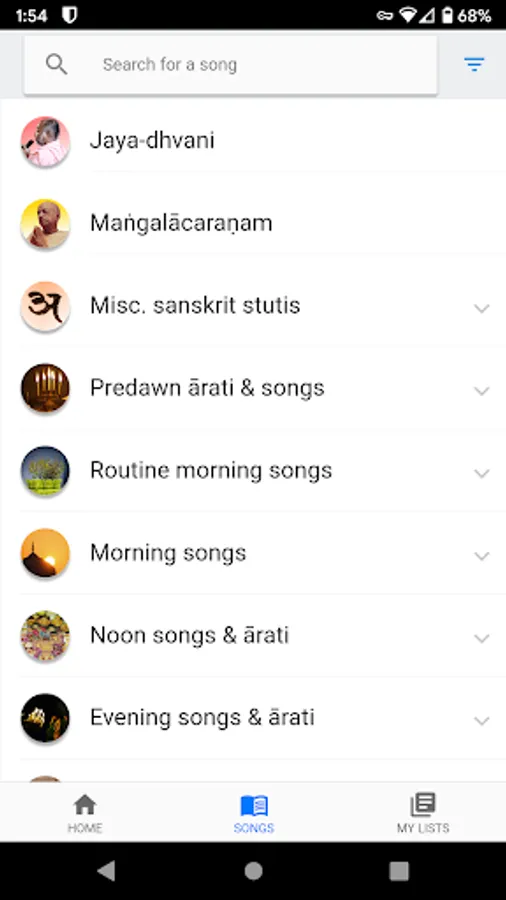 - Organized song index : Songs arranged by tattva and time of day among other different