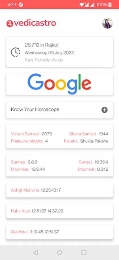 This application facilities of astrology. It provides day wise Weather, Muhurta, Yog, kaal, nakshatra, Tithi. You can get your horoscope also by adding your birth details.