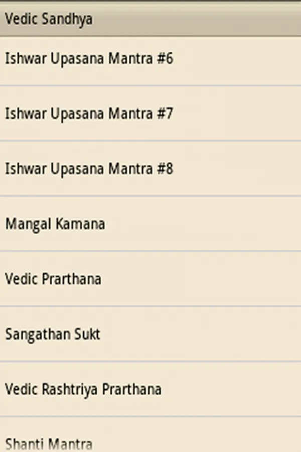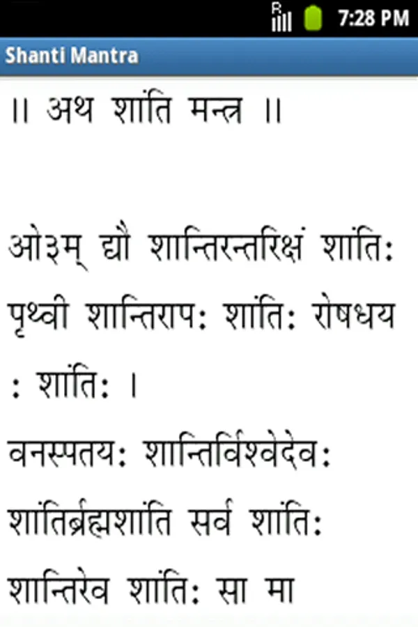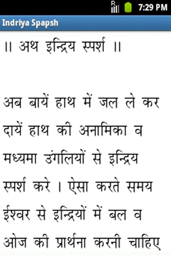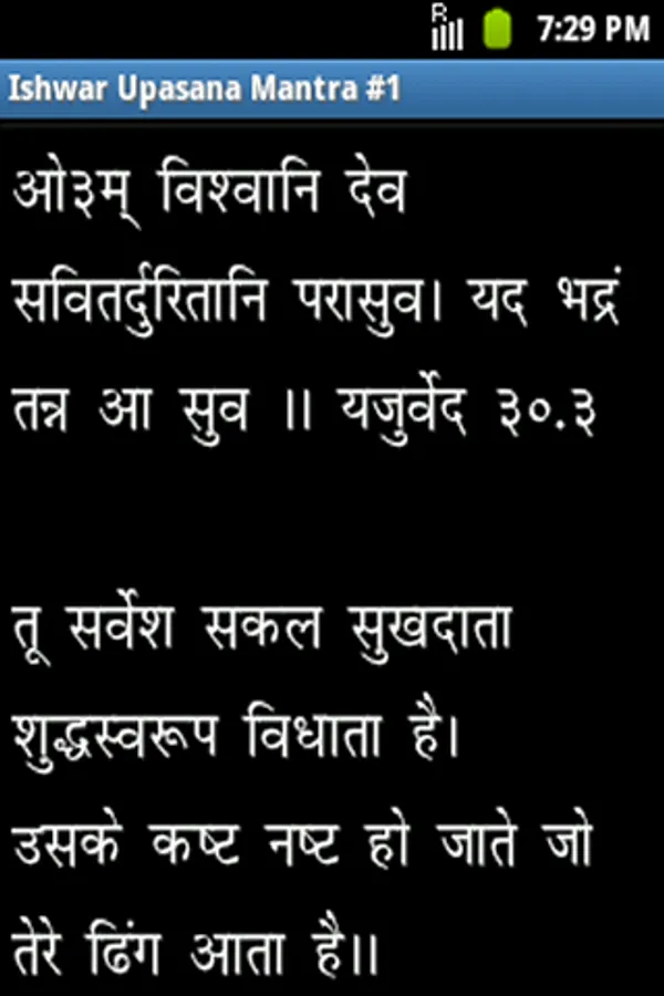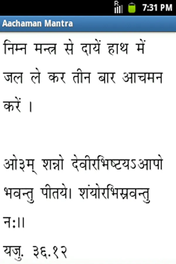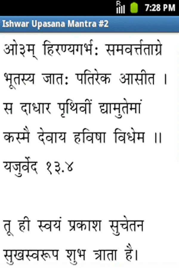 Vedic Sandhya (वैदिक संध्या) is Ishwar Upasana which every one should do in Morning & Evening. This Vedic Sandhya Application provides all the mantras of Vedic Sandhya with Hindi Meaning and also includes Ishwar Stuti Prarthana Upasana Mantra, Vedic Prarthana, Sangathan Sukt, Vedic Rashtriya Prarthana and Shanti Mantra. The recommended font size to be choose within the application is 27 or 33.