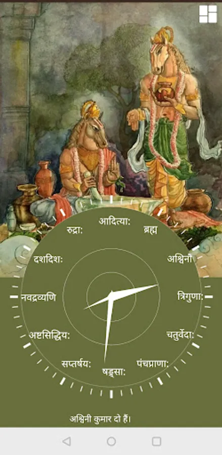 इस घडी में १ से १२ के स्थान पर क्रमशः ब्रह्म, अश्विनौ, त्रिगुणा, चतुर्वेदा, पञ्चप्राणा:, षड्रसाः, सप्तर्षयः, अष्टसिद्धयः, नवद्रव्याणि, दशदिशः, रुद्राः एवं आदित्याः लिखा है। ये सभी देवताओं अथवा गुणों का प्रतिनिधित्व करते हैं और जिस स्थान पर वे हैं उनकी संख्या भी उतनी ही है। इनमें से १२ आदित्य, ११ रूद्र एवं २ अश्विनीकुमारों की गिनती हिन्दू धर्म के प्रसिद्ध ३३ कोटि देवताओं में की जाती है।