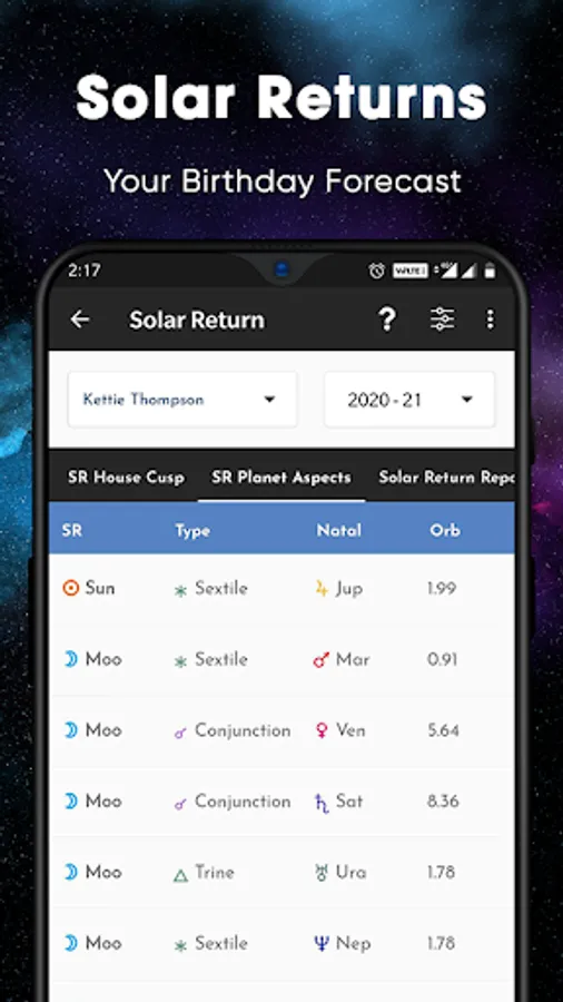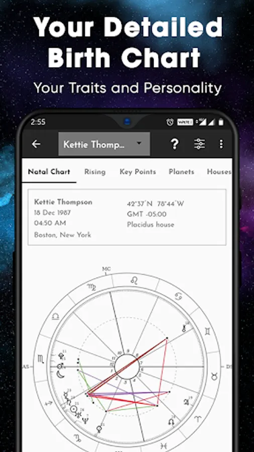 - You can also add your friends' and family members’ birth details and start viewing their natal charts, solar returns and much more.