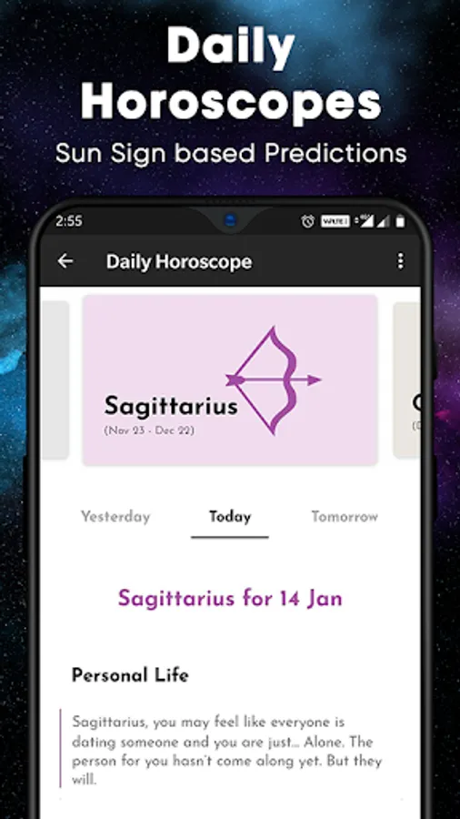 - Know your horoscope for yesterday, today and tomorrow in 6 different life categories - Love, Career, Health, Emotions, Travel, and Luck.
