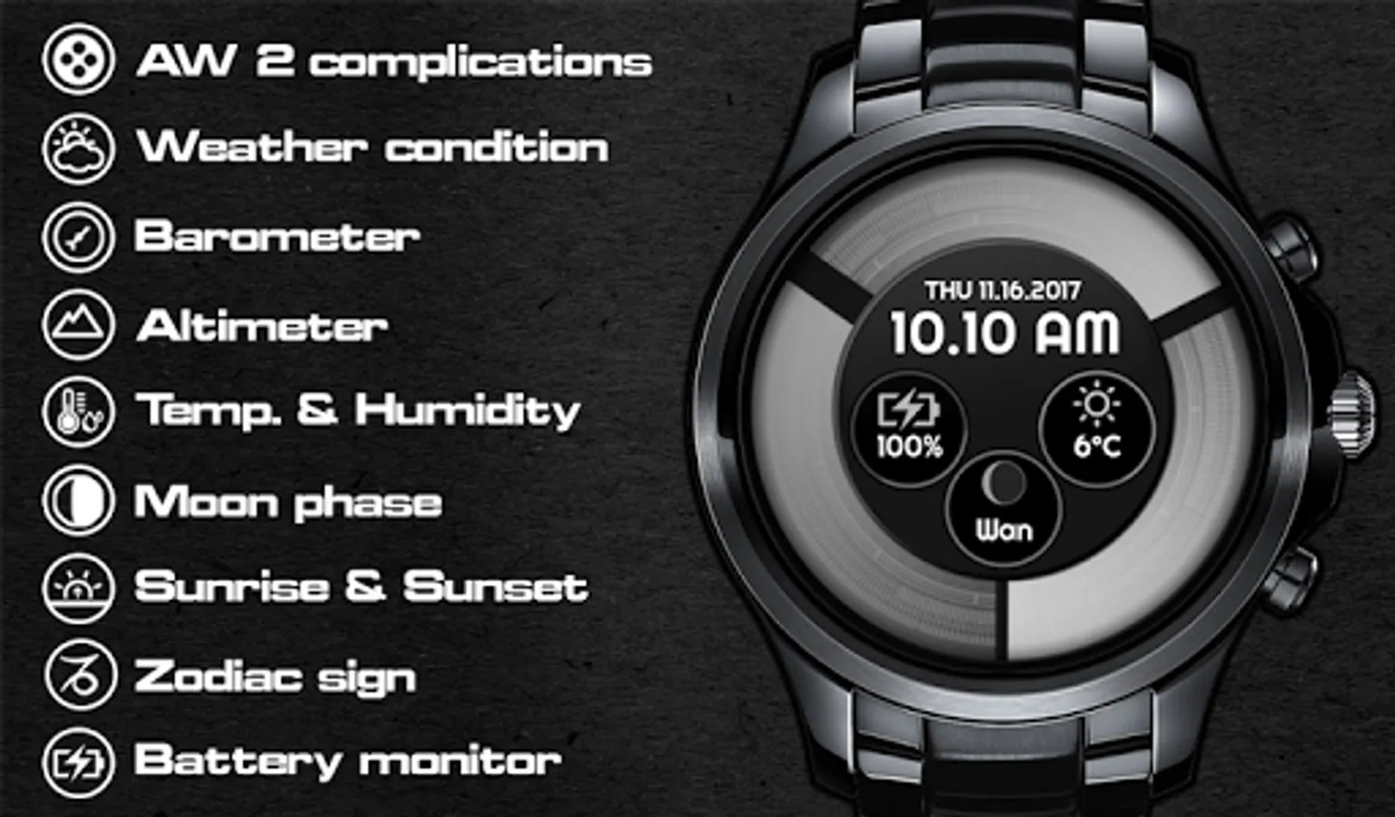 For further reference about configuration and installation procedures, please check the watch face support page here: https://www.veertualia.com/android-wear-watch-face-radiance-contrast-minimalist-and-elegant/