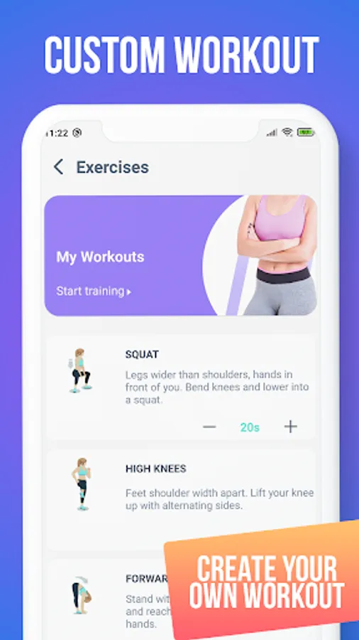 Custom Workouts allows you to build your own programs with banch of exercises available. You can choose exercises, duration and challenge yourself with your own training. Cardio Workout by Veev Apps provides several type workouts, such as High Intensity Interval Training (HIIT),low impact etc.