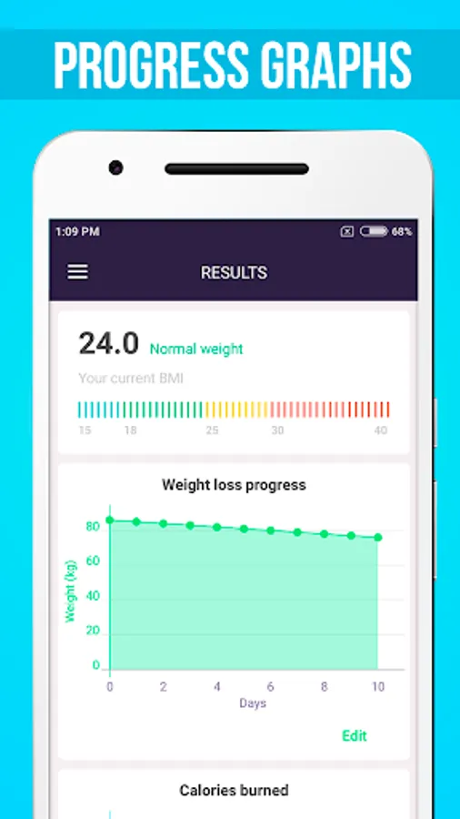 You can easily keep track of your weight loss progress and the number of calories burned. Carrying out training plan you will not only be able to remove the extra weight, but also to improve the body shape and fitness.