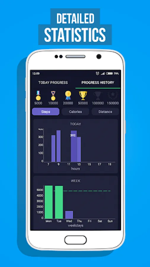 With the help of charts you can follow the statistics of your steps. See the graphs for the last 24 hours, a week or a month.