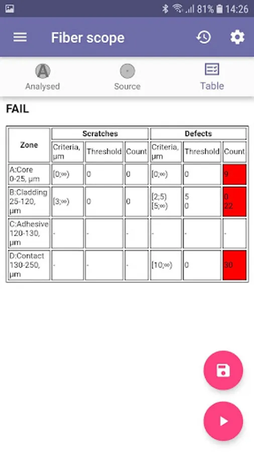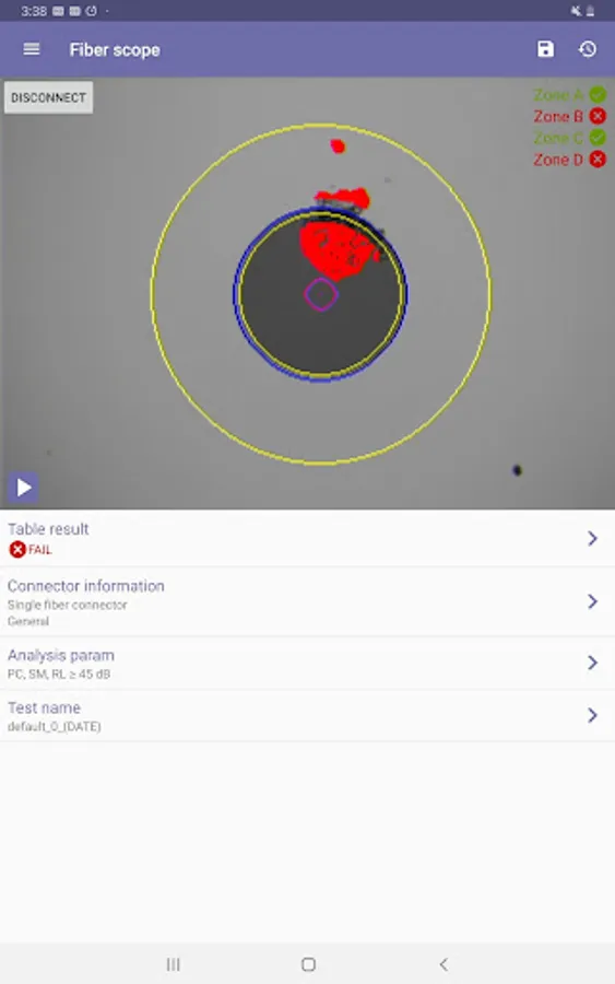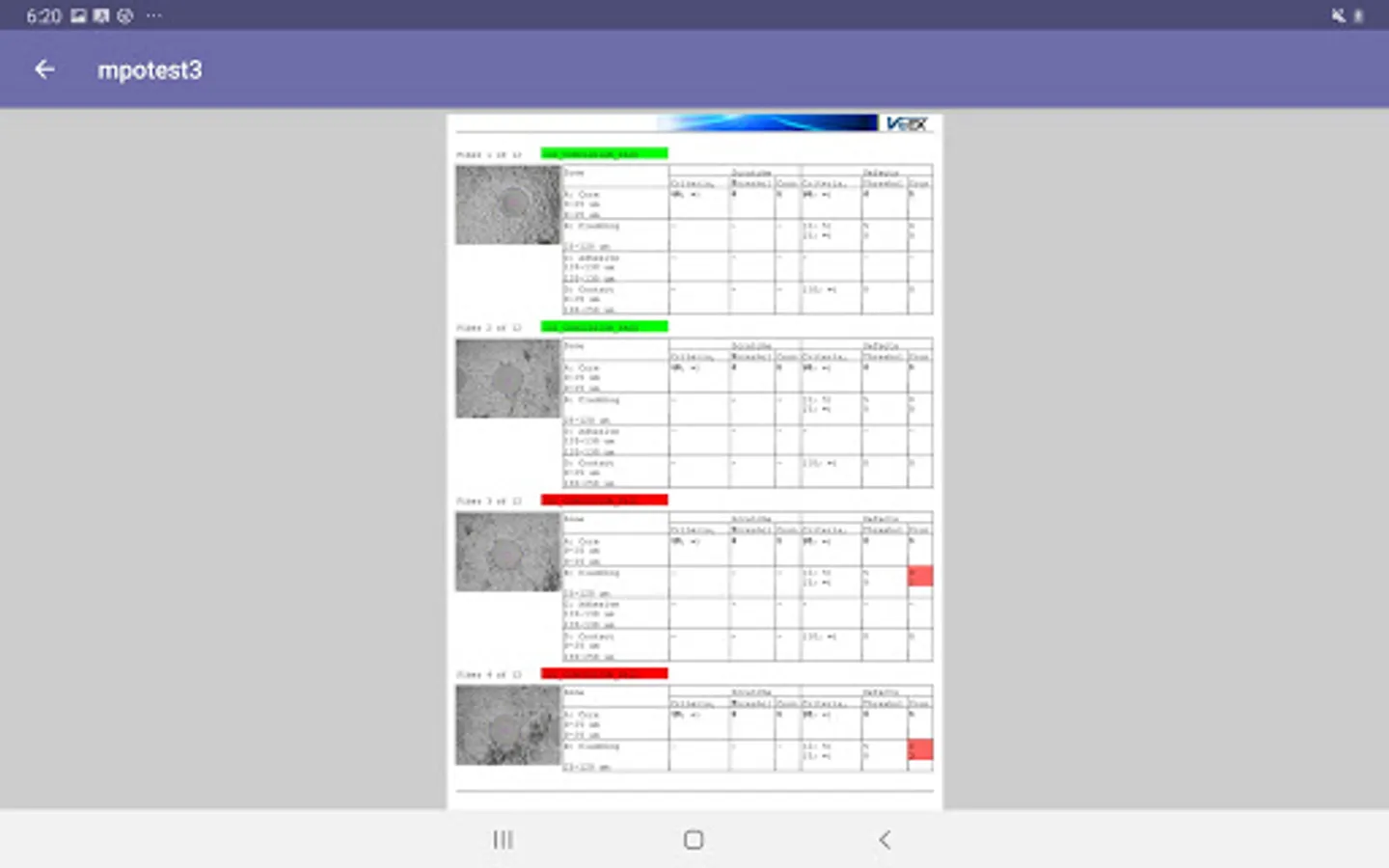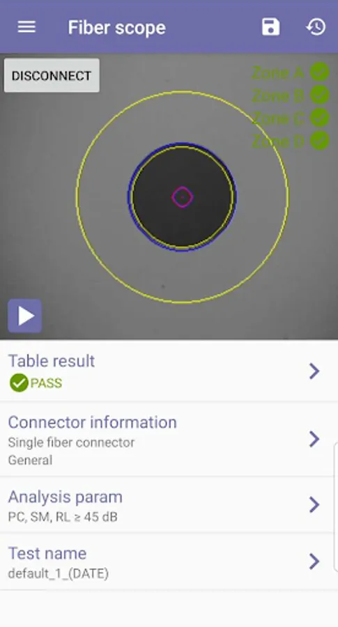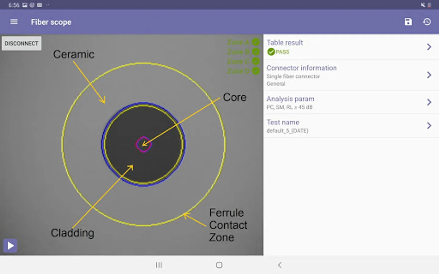 App designed to work with a variety of VeEX Fiberscopes (DI-3000, DI-1000, DI-1000MPO). View connector end faces for contamination, dents and/or scratches. Pass/Fail Analysis in accordance with IEC-61300-3-35 standards. Save images in .jpg files format.