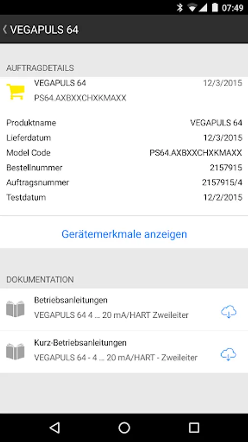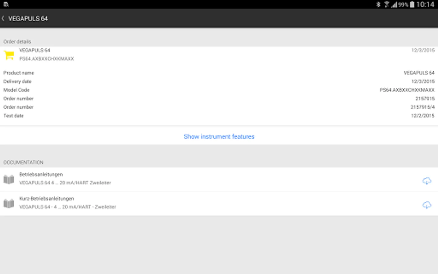 General device information (instrument name, article number, delivery date, etc.), an overview of product features and the device-specific documentation (operating instructions, test certificates and safety notes) are thus available anytime, anywhere.