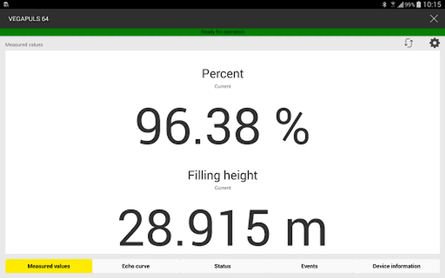 By making use of the tilt sensor integrated in the smartphone, the app also allows the user to optimally align the radar sensor with the tank discharge opening in bulk solids applications.