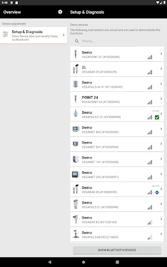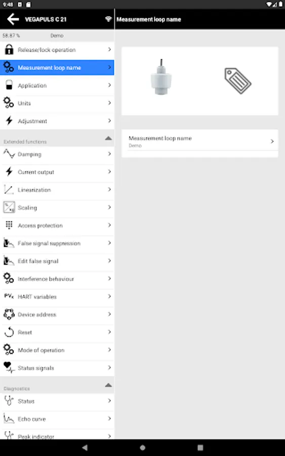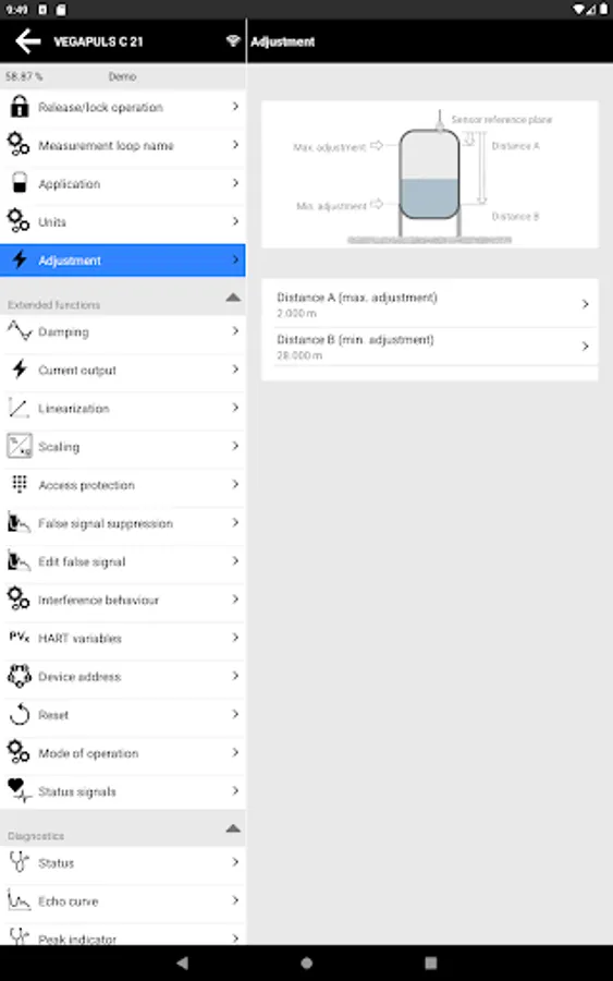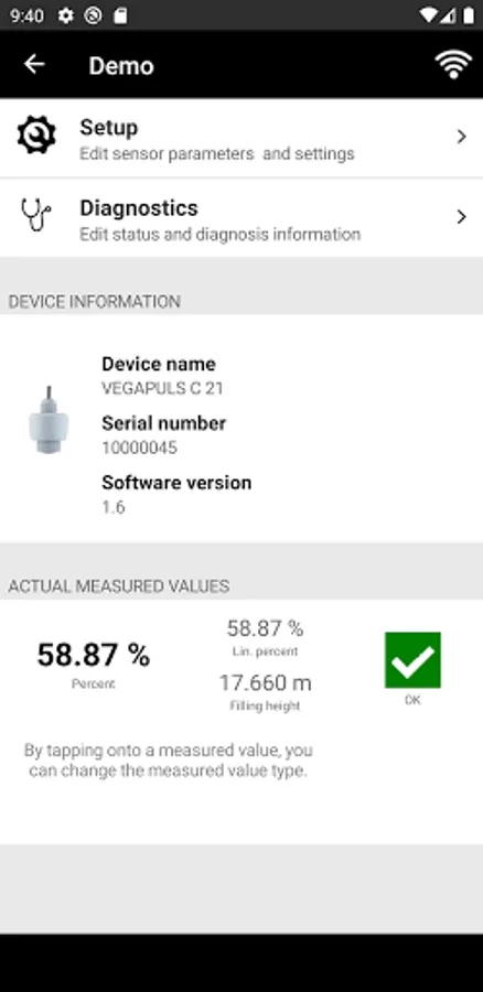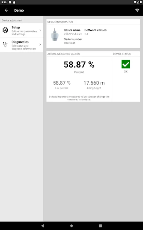 With the smartphone or the tablet you have comfortable access to the device control of the sensor.