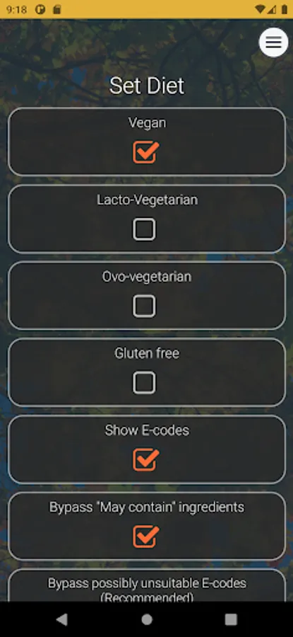 Available diets: Vegan, Lacto-vegetarian, Ovo-vegetarian, Avoid palm oil, and Gluten.