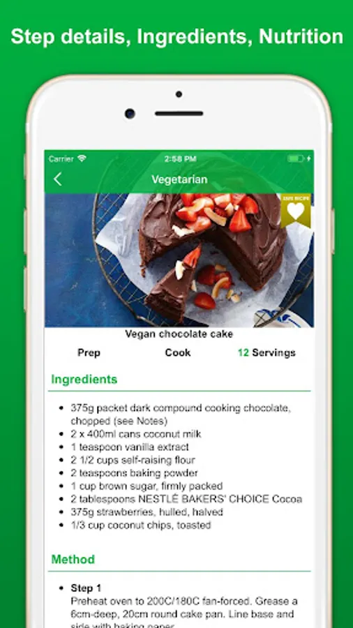 Detailed instructions on cooking steps, ingredients and nutrition.