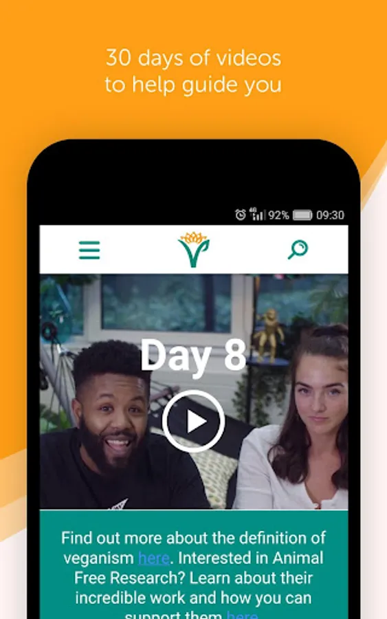 * Watch daily videos presented by our expert vegan guides, covering the most common struggles and questions about going vegan.